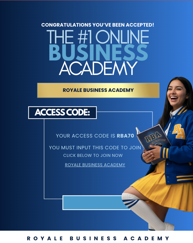 Start your Digital RBA Business Today. Once you make your purchase, you will be prompted to enter a code to get access to the Royale Business Academy community. Use the Code on the picture above .